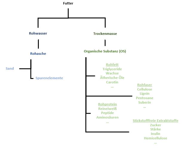 Diese sind zurückzuführen auf die sogenannte Weender Futtermittelanalyse. Unterschieden wird hierbei grundsätzlich zwischen Rohasche, Rohfaser, Rohprotein, Rohfett und stickstofffreien Extraktstoffen (NfE). Diese Angaben sind auf die Trockenmasse bezogen, welche entsteht, wenn eine Probe getrocknet wird. Dabei werden Rohwasser und einige flüchtige Bestandteile wie etwa Ammoniak, Alkohol oder Essigsäure entzogen und was übrigbleibt, ist die sogenannte Trockenmasse, welche alle effektiv verwertbaren Bestandteile wie Eiweiße, Fette usw. enthält.