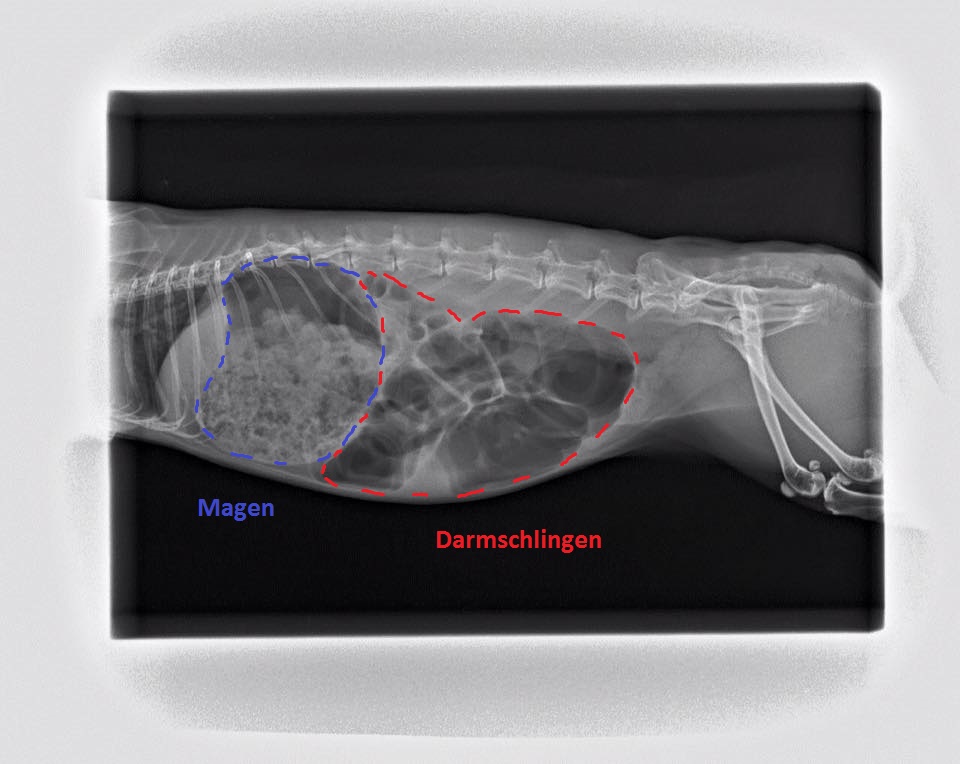 Die markierten Bereiche des Magen-Darm-Trakts sollten eigentlich homogen mit einer weißlichen Masse gefüllt sein. Hier erkennt man große und viele Gasansammlungen als schwarze Flächen.