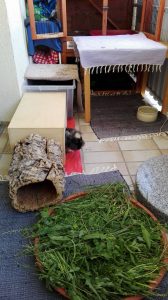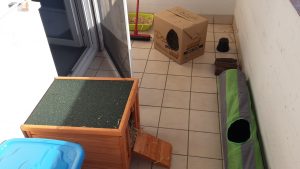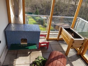 Ein „Kaninchenbalkon“ muss abwechslungsreich eingerichtet sein. Auf jeden Fall brauchen die Kaninchen eine wetterfeste Schutzhütte. Tipp: Um den Kaninchen noch mehr Platz für viel Bewegung zu ermöglichen, kann man eine Schutzhütte bauen, die mehrstöckig ist, so gibt es noch mehr Bewegungsmöglichkeiten nach oben hin. Von Ställen, in denen eine Zinkwanne zur besseren Reinigung angebracht ist, ist eher abzuraten, da es in solchen Ställen im Sommer aufgrund der Zinkwanne, die sich durch die Sonne aufwärmt, schnell zu heiß wird. Viele andere Einrichtungsgegenstände außerhalb der Schutzhütte sind auch sehr wichtig, es gibt jede Menge Möglichkeiten, den „Kaninchenbalkon“ abwechslungsreich zu gestalten, zum Beispiel erhöhte Aussichtsplätze, Schlafhäuschen, Korkröhren, ausgehöhlte Baumstämme, Möglichkeiten zum Buddeln und vieles mehr. Aber natürlich können auch hier einige Ikea-Artikel zweckentfremdet werden, wenn sie der Witterung entsprechend geschützt werden. Im Sommer muss darauf geachtet werden, Kaninchen immer ausreichend Schatten zu spenden, ansonsten droht der Hitzschlag. Eine Markise, ein Sonnenschirm oder auch Coolpads, eingefrorene Wasserflaschen und feuchte Handtücher können ein wenig Abhilfe schaffen. Man sollte aber immer berücksichtigen, dass die Sonne wandert.