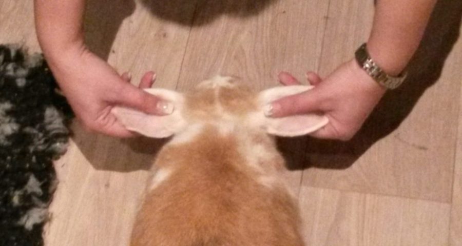 Man umfasst vorsichtig die Ohren soweit am Ansatz wie möglich und übt sanften Zug in Wuchsrichtung aus. Kurz den Zug halten und dann wieder lösen. Dies wiederholt man ein paarmal. Meistens beginnt das Kaninchen sofort zu knuspern und empfindet es als entspannend.