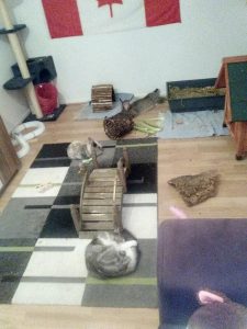 Ein kaninchensicheres Zimmer ist eine gute Möglichkeit, seine Kaninchen drinnen zu halten. Hier können sie den ganzen Tag und die ganze Nacht hoppeln und sich wohl fühlen. Bei dieser Haltung eignet sich zum Toilettengang und als Aussichtsplatz ein handelsüblicher Käfig, der immer offensteht. Ein Handtuch oder eine Weidenbrücke sollte in den Eingang gelegt werden, falls die Tür drin bleibt, damit die Kaninchen nicht in den Gitterstäben hängen bleiben. Bestenfalls wird die kleine Tür direkt entfernt. Bleibt das Gitteroberteil auf dem Käfig, sollte auch hier ein Teppich oder Brett darauf gelegt werden. Anderenfalls können sich die Kaninchen leicht verletzen, wenn sie darauf springen und mit ihren Füßen zwischen die Gitterstäbe rutschen. Gleichzeitig haben sie so einen erhöhten Schlafplatz und einen verstärkten Höhleneffekt im Käfig. Alternativ kann man auch nur die Käfigunterschale verwenden. Alles, was sauber und heile bleiben soll, sollte unbedingt aus dem Zimmer entfernt oder gesichert werden: Kabel, Kanten von Schränken oder anderes Mobiliar und Fußbodenleisten. Diese können mit Gitterelementen direkt vor den Leisten geschützt werden. Da der Bodenbelag nicht rutschig sein sollte, können waschbare (falls die Tiere nicht stubenrein sind) Teppiche oder rauer PVC verlegt werden. Der PVC sollte zudem so verlegt sein, dass die Kaninchen den Rand nicht anknabbern können. Die Steckdosen müssen mit Kindersicherungen (Ikea, Baumarkt) abgesichert und die Tapeten zum Beispiel mit Plexi-/ Bastlerglas, Brettern, Folie etc. geschützt werden. Mit Gitterelementen kann auch ein Teil des Raumes abgetrennt werden, um Futter, Heu, Einstreu, Transportbox etc. zu lagern. Doch die kleinen Langohren müssen immer noch einen dauerhaften Platz von mindestens 3m² pro Nase zur Verfügung haben. Für die Einrichtung des Zimmers lohnt auch ein Blick über den Tellerrand hinaus. Neben tierischen Onlineshops oder Zoofachgeschäften bieten auch Möbelhäuser (wie Ikea) tolle zweckentfremdete Möglichkeiten für die Einrichtung eines Kaninchenparadieses.