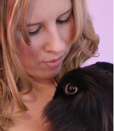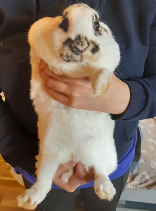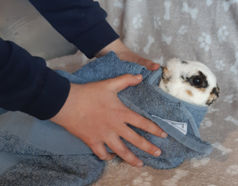 Hilfreich kann es sein, wenn man Medikamente eingeben muss oder den Kopf untersuchen möchte, das Kaninchen in ein Handtuch einzuwickeln, sodass nur noch der Kopf rausguckt. Die Gliedmaßen und der Rücken sind fixiert (siehe Foto 4, die Ohren dürfen anders als auf dem Foto natürlich herausgucken)