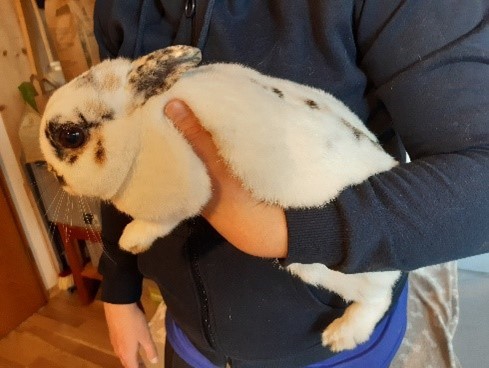• Zum Tragen kann man das Tier zum Beispiel auf den angewinkelten Unterarm setzten. Zur Sicherheit wird die rechte Hand auf den Nacken des Kaninchens gelegt, so kann man es notfalls sofort greifen, falls es zu zappeln beginnt. Dabei ist es eine sehr sichere Variante die Hinterbeine nach unten „hängen“ zu lassen und dabei aber das Hinterteil mit dem Arm am Körper zu fixieren. Denn so kann das Kaninchen keine Kraft mit den Hinterbeinen aufbauen, um sich weg zu stoßen. Die Vorderbeine werden durch die Hand desselben Armes gehalten und zwar wieder so, dass der Zeigefinger zwischen die Vorderbeine kommt. (siehe Foto 2)
