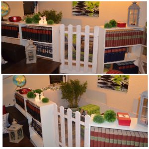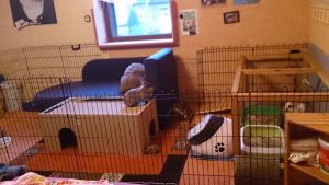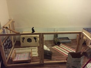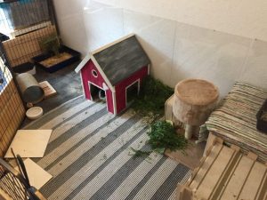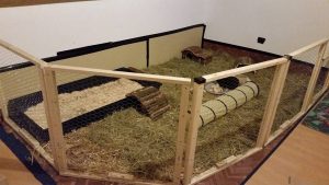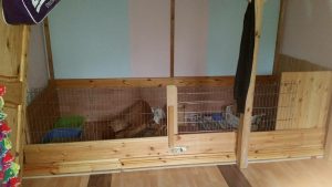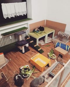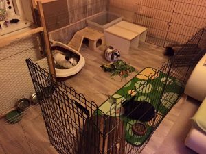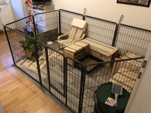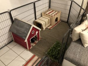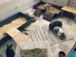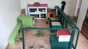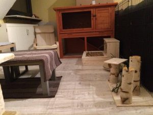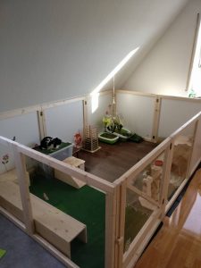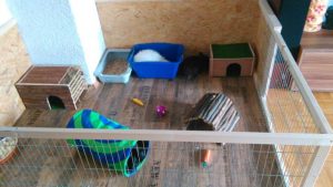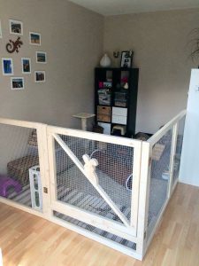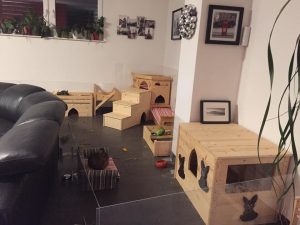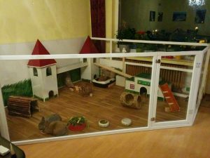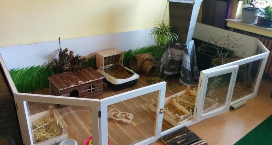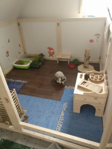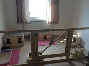 Mit Gitterelementen oder auch sogenannten „Welpenausläufen“, die im Handel oder online erhältlich sind, wird ein bestimmter Bereich abgegrenzt. Die Elemente werden einfach zusammengesteckt, sind einzeln beweglich und folglich komplett flexibel. Sie sollten mindestens 80 cm hoch sein, da es für die Tiere sonst ein leichtes Spiel ist, sie zu überspringen. Alternativ kann man natürlich auch selbst mit Holzrahmen und Draht oder Plexi-/Bastlerglas ein Gehege bauen, Möbel umfunktionieren oder bei diversen Onlineanbietern ein Gehege kaufen. Da der Bodenbelag nicht rutschig sein sollte, können waschbare (falls die Tiere nicht stubenrein sind) Teppiche oder rauer PVC verlegt werden. Der PVC sollte zudem so verlegt sein, dass die Kaninchen den Rand nicht anknabbern können. Die Steckdosen müssen mit Kindersicherungen (Ikea, Baumarkt) abgesichert und die Tapeten zum Beispiel mit Plexi-/Bastlerglas, Brettern, Folie etc. geschützt werden. Für die Einrichtung des Geheges lohnt auch ein Blick über den Tellerrand hinaus. Neben tierischen Onlineshops oder Zoofachgeschäften bieten auch Möbelhäuser (wie Ikea) tolle zweckentfremdete Möglichkeiten für die Einrichtung eines Kaninchenparadieses.